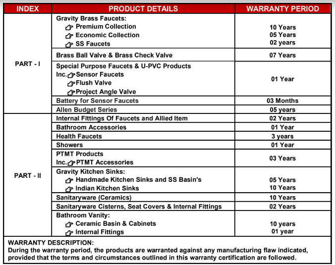 I. Gravity Bath Private Limited provides a warranty on all of its products for the duration of the warranty period stated ON SITE. The warranty duration varies depending on the product. Kindly refer to the warranty certificate for more information.